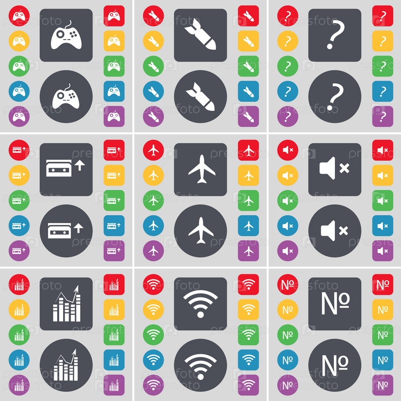 Геймпад, ракета, вопросный знак, кассеты, самолет, Mute, Count, Wi-Fi, номер значка символа. большой набор плоских цветных кнопок для вашего дизайна. вектор