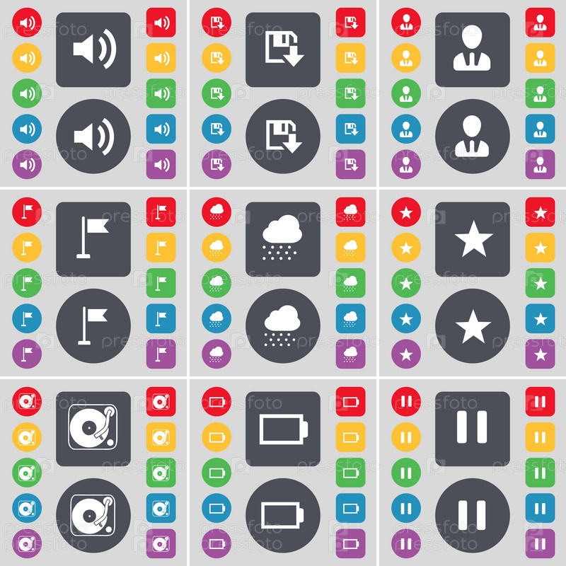 Звук, флоппи, аватар, гольф отверстие, облако, звезда, граммофон, батареи, значок символ паузы. Большой набор плоских, цветные кнопки для вашего дизайна. Вектор