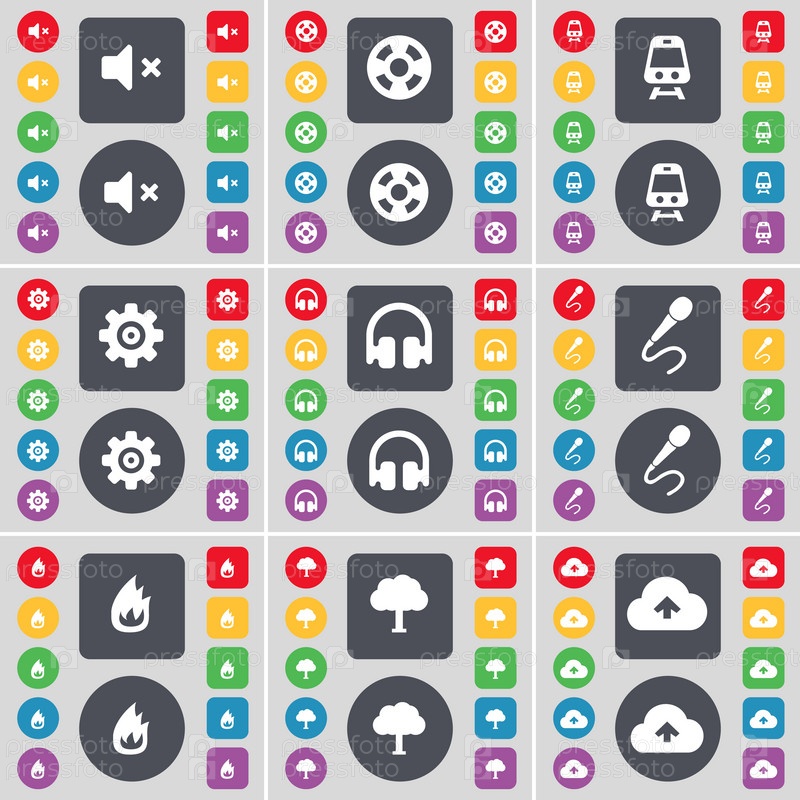 Немой, видеозапись, поезд, снаряжение, наушники, микрофон, огонь, дерево., Облако значок символа. Большой набор плоских, цветные кнопки для вашего дизайна. Вектор