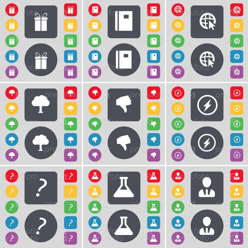 Подарок, ноутбук, веб-курсор, дерево, неприязнь, Флэш, вопрос, флаг, символ значка аватара. большой набор плоских цветных кнопок для вашего дизайна. вектор