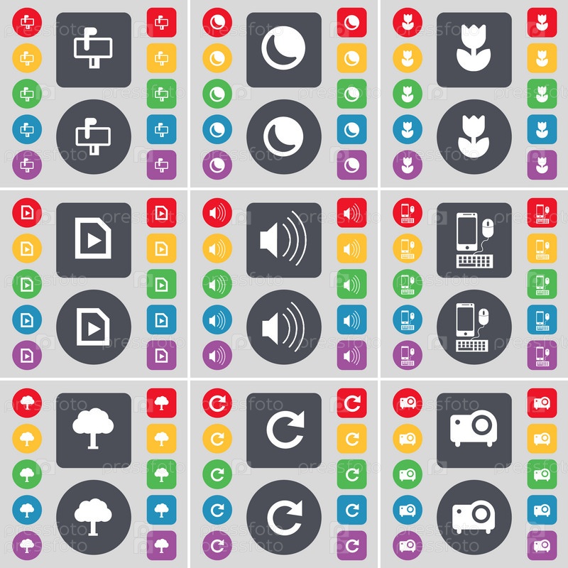 Почтовый ящик, Луна, цветок, файл мультимедиа, звук, смартфон, дерево, перезагрузка, проектор значок символа. Большой набор плоских, цветные кнопки для вашего дизайна. Вектор