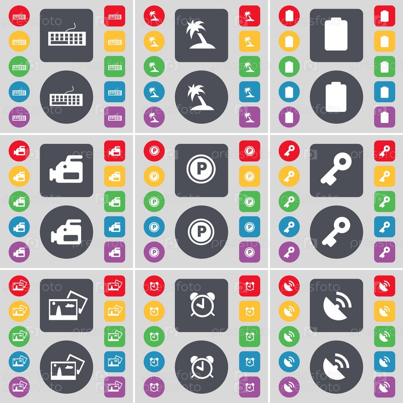 Клавиатура, пальма, батареи, пленочная камера, парковка, ключ, фотография, будильник, спутниковая тарелка значок символа. большой набор плоских цветных кнопок для вашего дизайна. вектор