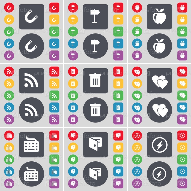Магнит, указатель, яблоко, RSS, мусорный бак, сердце, клавиатура, кошелек, значок символа Flash. Большой набор плоских цветных кнопок для вашего дизайна. вектор