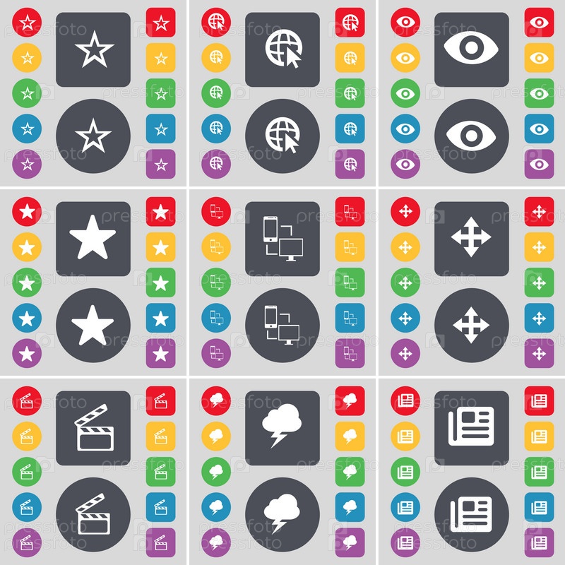 Звезда, веб курсора, видение, звезда, связи, перемещение, Клаппер, молнии, газета значок символа. Большой набор плоских, цветные кнопки для вашего дизайна. Вектор