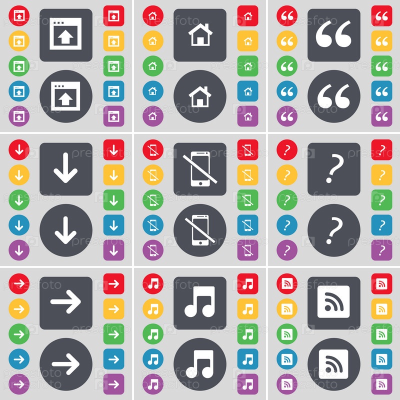 Окна, дом, запятые, стрелка вниз, смартфон, вопросительный знак, стрелка направо, примечание, значок символа RSS. Большой набор плоских цветных кнопок для вашего дизайна. вектор