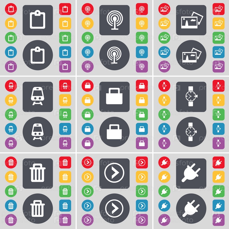 Обследования, Wi-Fi, фотография, поезд, замок, наручные часы, мусор может, стрелка направо, значок символа Socket. Большой набор плоских цветных кнопок для вашего дизайна. вектор