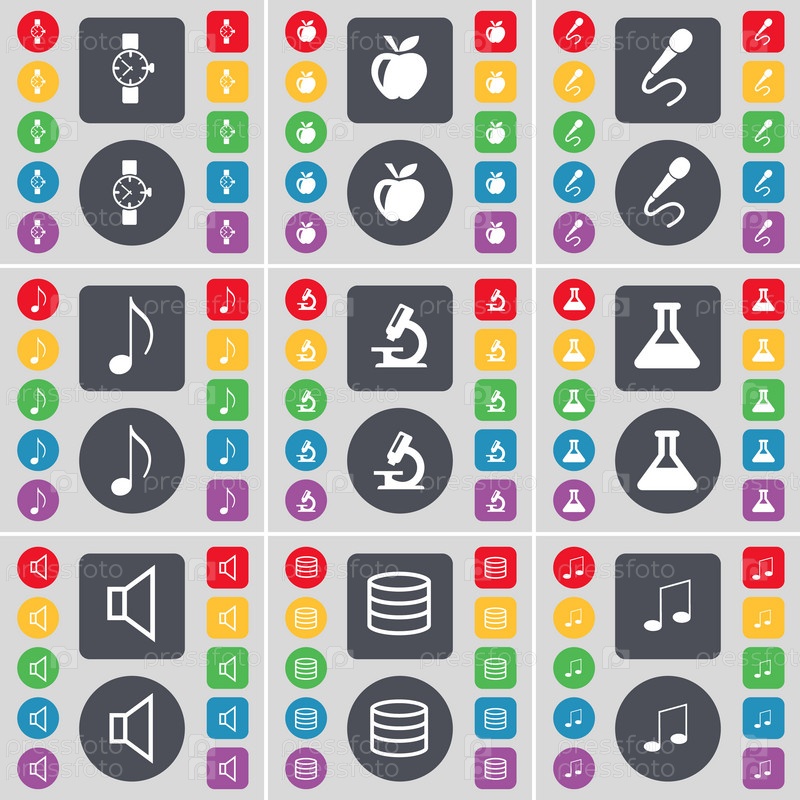 Наручные часы, яблоко, микрофон, Примечание, Микроскоп, фляга, звук, базы данных, обозначение значок примечания. Большой набор плоских, цветные кнопки для вашего дизайна. Вектор