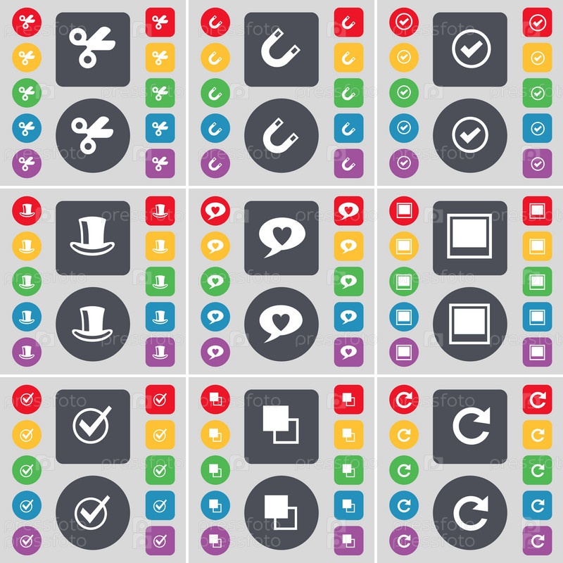 Ножницы, магнит, тик, цилиндр, чат пузырь, окна, тик, копировать, перезагрузить значок символа. Большой набор плоских, цветные кнопки для вашего дизайна. Вектор