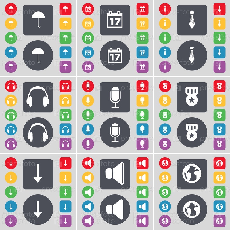 Зонты, календарь, галстук, наушники, микрофон, медаль, стрелка вниз, звук, значок символ земли. Большой набор плоских, цветные кнопки для вашего дизайна. Вектор