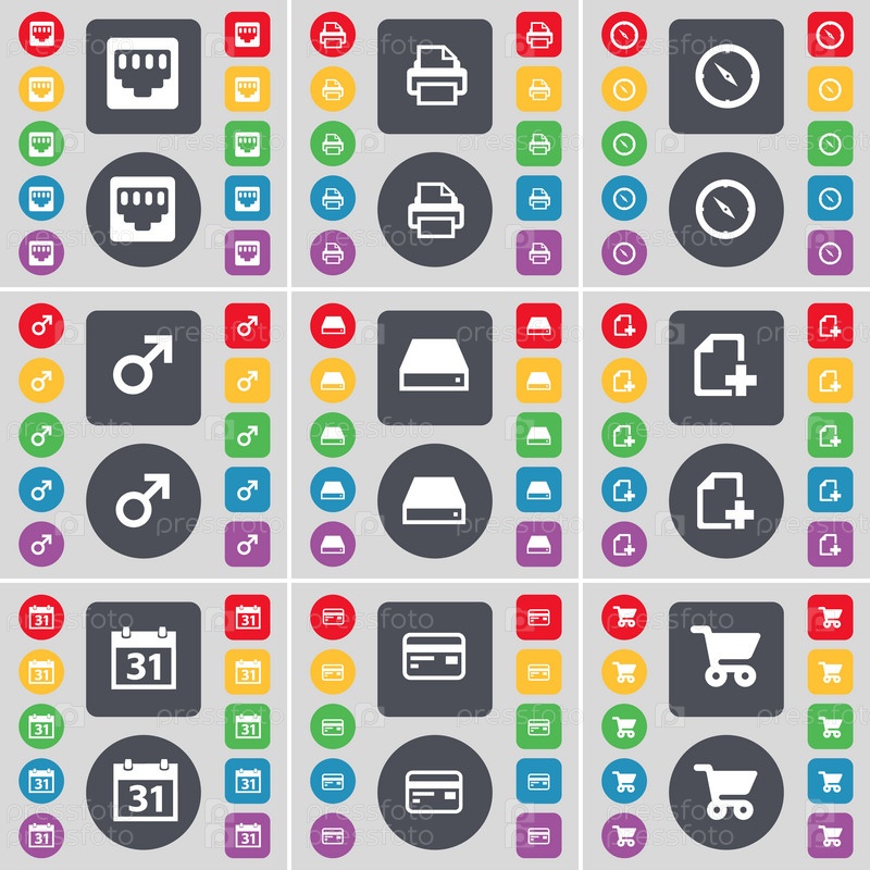Разъем LAN, принтер, компас, символ Марса, жесткий диск, файл, календарь, кредитная карта, торговая тележка иконка символа. Большой набор плоских цветных кнопок для вашего дизайна. вектор