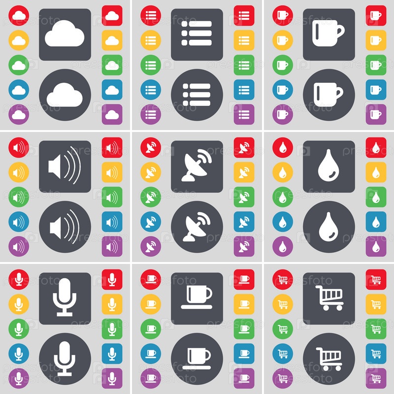 Облако, список, Кубок, звук, Спутниковая тарелка, падение, микрофон, торговых тележка значок символа. Большой набор плоских, цветные кнопки для вашего дизайна. Вектор