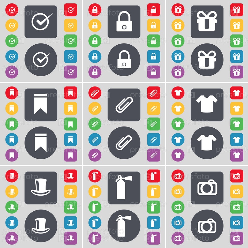 Тик, замок, подарок, маркер, клип, футболку, шелк шапка, Огнетушитель, символ значок камеры. Большой набор плоских, цветные кнопки для вашего дизайна. Вектор