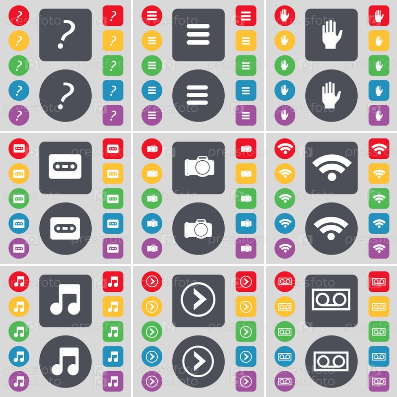 Котировки, приложения, рука, кассеты, Wi-Fi, примечание, стрелка направо, иконка символа кассеты. большой набор плоских цветных кнопок для вашего дизайна. вектор