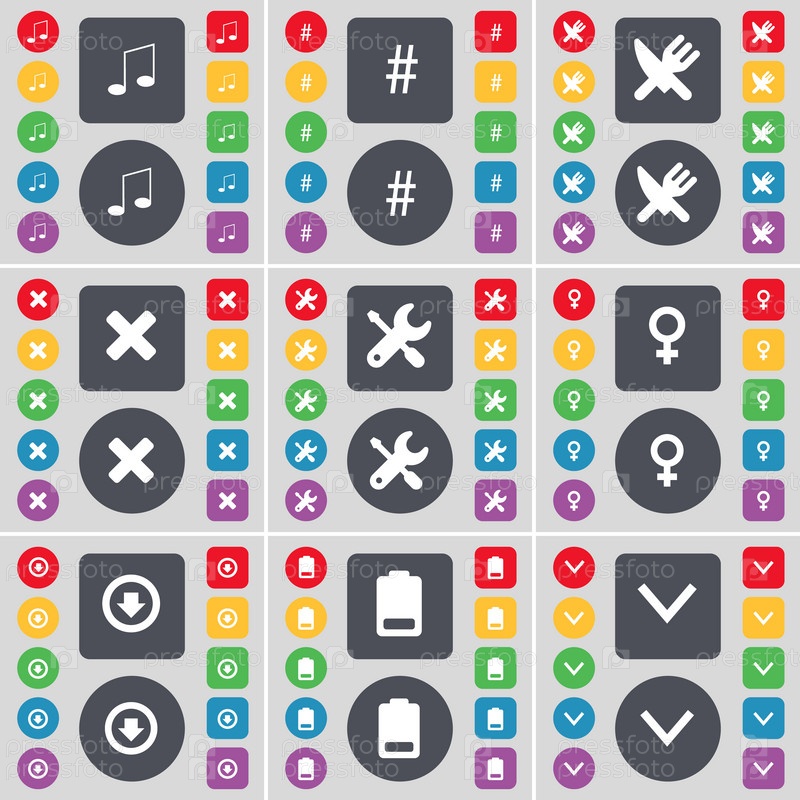 Примечание, Hashtag, вилка и нож, стоп, гайковерт, символ Венеры, стрелка вниз, батарея, стрелка вниз значок символа. Большой набор плоских цветных кнопок для вашего дизайна. вектор