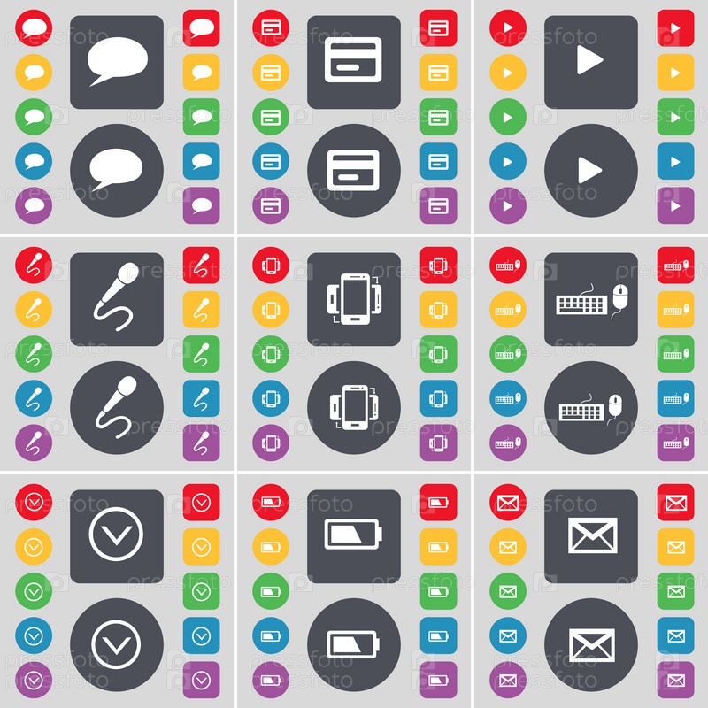 Чат пузырь, кредитной карты, средства массовой информации играют, микрофон, смартфон, клавиатуры, стрелка вниз, батарея, символ значок сообщения. Большой набор плоских, цветные кнопки для вашего дизайна. Вектор