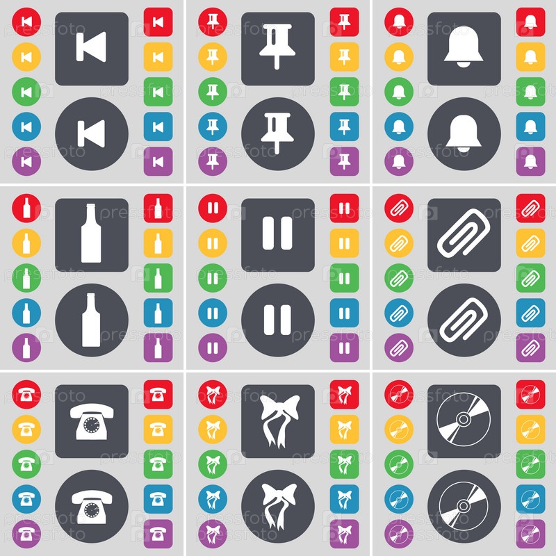 Медиа дисплей, пин, уведомления, бутылка, пауза, клип, ретро-телефон, лук, символ иконки диска. Большой набор плоских цветных кнопок для вашего дизайна. вектор