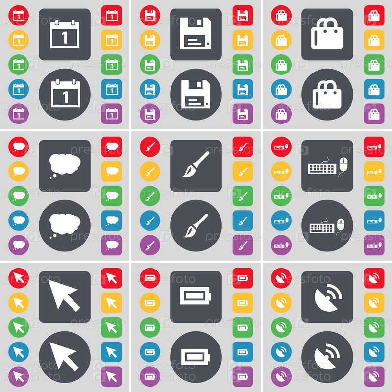 Календарь, флоппи, сумка, чат облако, кисти, клавиатуры, курсора, батареи, Спутниковая тарелка значок символ. Большой набор плоских, цветные кнопки для вашего дизайна. Вектор