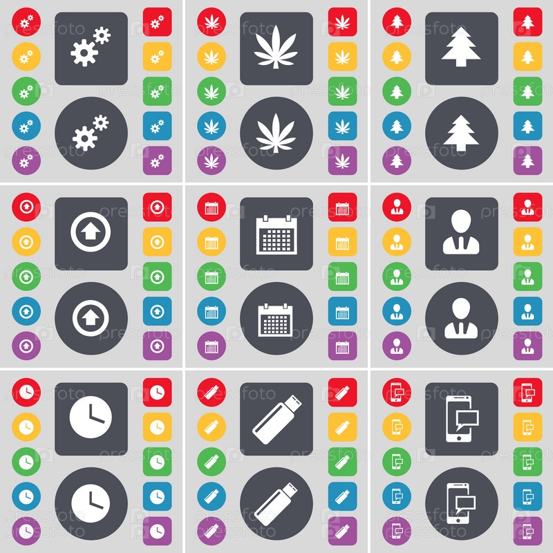 Оборудование, марихуана, елка, стрелка вверх, календарь, аватар, часы, USB, символ значка SMS. Большой набор плоских цветных кнопок для вашего дизайна. вектор