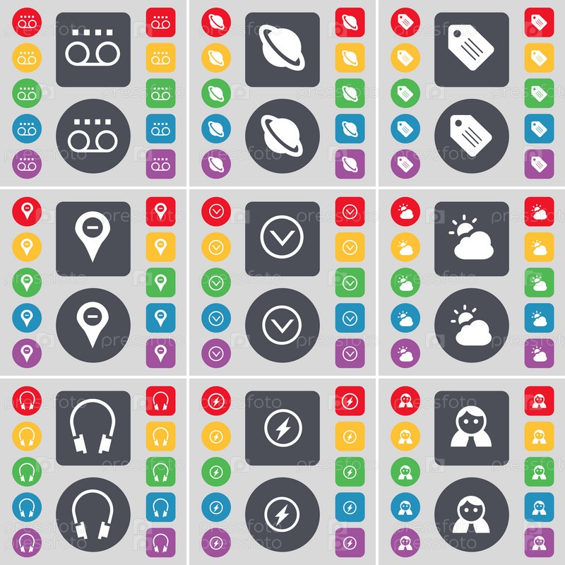 Кассета, планета, тег, контрольно-пропускной пункт, стрелка вниз, облако, наушники, Флэш, значок символа аватара. Большой набор плоских цветных кнопок для вашего дизайна. вектор