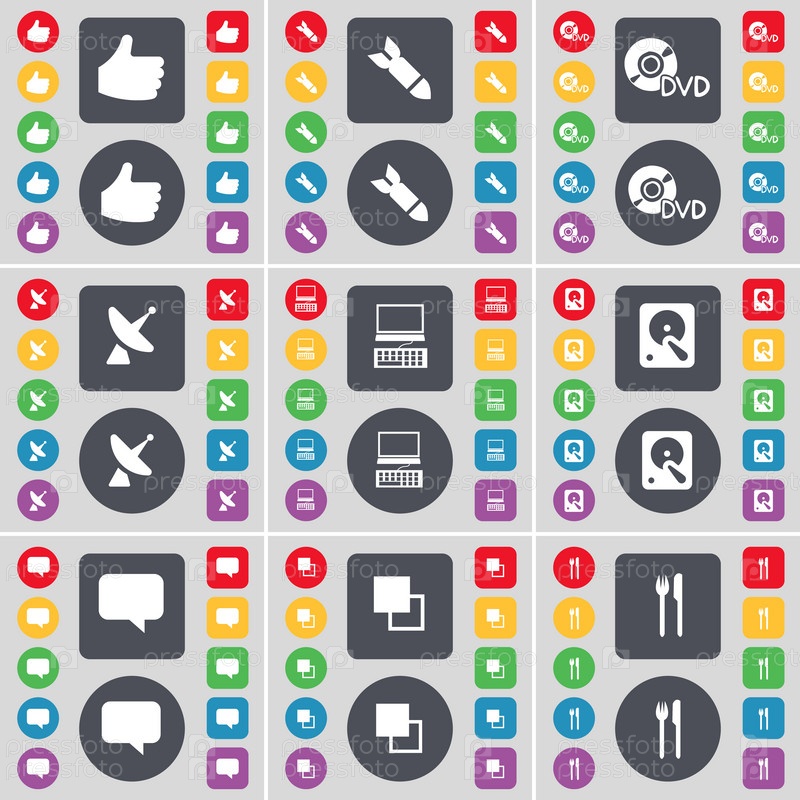 Стороны, ракета, DVD, спутниковая тарелка, ноутбук, жесткий диск, пузырь чата, копирование, вилка и нож значок символа. большой набор плоских цветных кнопок для вашего дизайна. вектор
