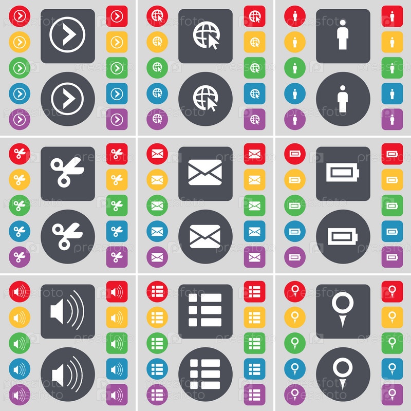 Стрелка справа, веб курсора, силуэт, ножницы, сообщение, батарея, звук, список, символ значок контрольной точки. Большой набор плоских, цветные кнопки для вашего дизайна. Вектор