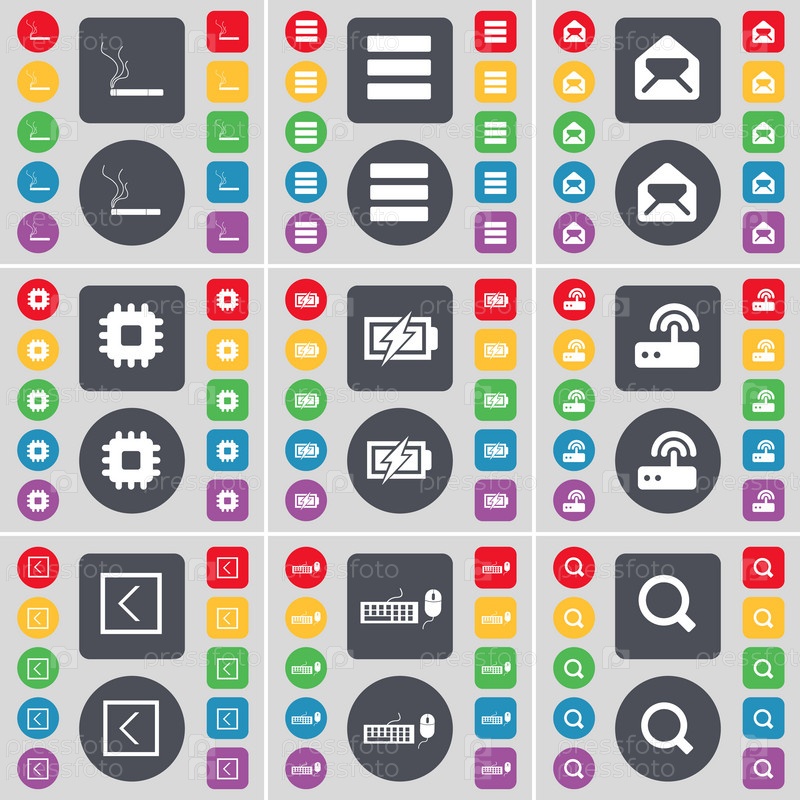 Сигареты, приложения, сообщение, процессор, зарядка, маршрутизатор, стрелка влево, клавиатура, символ иконки увеличительного стекла. Большой набор плоских цветных кнопок для вашего дизайна. вектор
