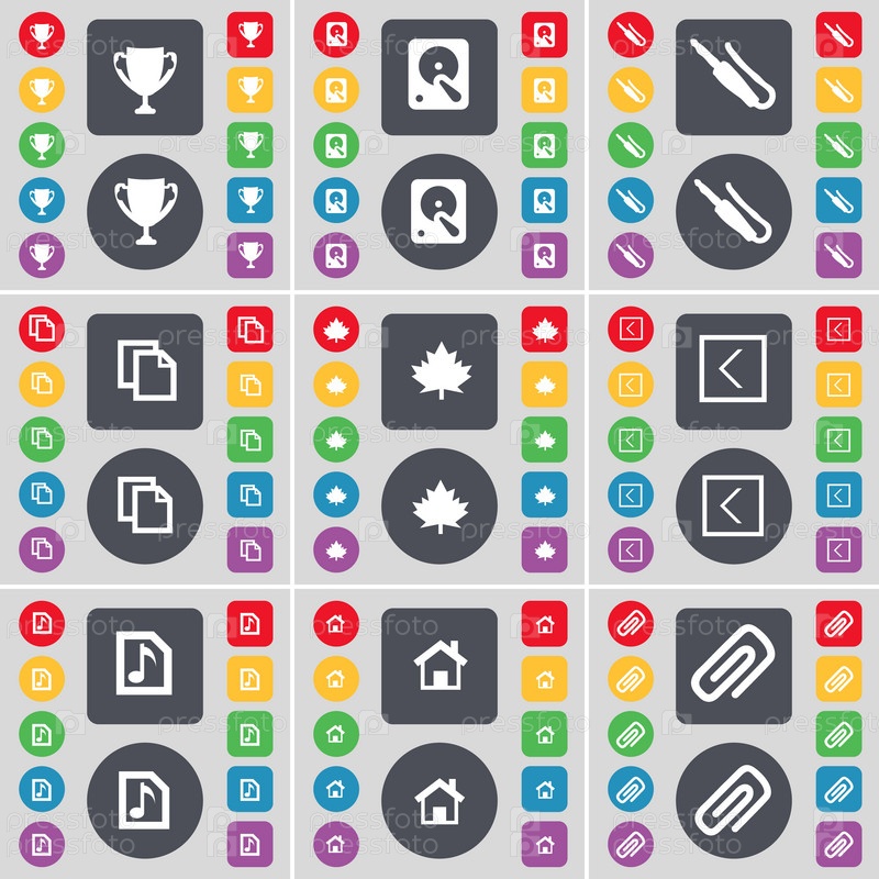 Кубок, жесткий диск, разъем для микрофона, копирования, клен лист, стрелка влево, музыкальных файлов, дом, значок символ фрагмента ролика. Большой набор плоских, цветные кнопки для вашего дизайна. Вектор