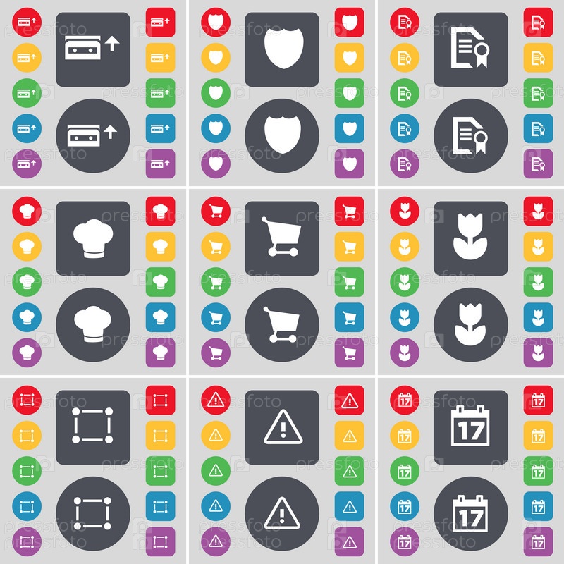Кассета, знак, текстовый файл, приготовление шляпу, корзина, цветок, кадр, предупреждение, символ значок календаря. Большой набор плоских, цветные кнопки для вашего дизайна. Вектор