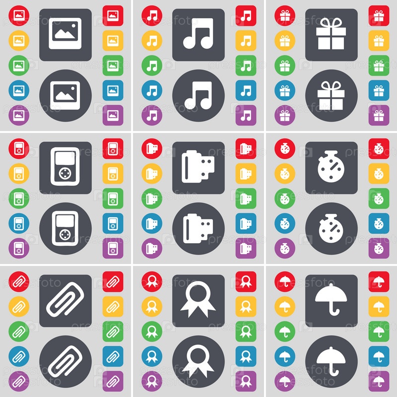 Медиа-окна, обратите внимание, подарок, игрок, негативных пленок, секундомер, клип, медаль, зонтик значок символа. Большой набор плоских, цветные кнопки для вашего дизайна. Вектор