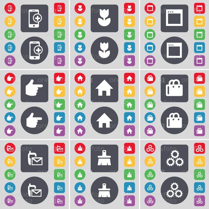 Смартфон, цветок, окно, рука, дом, торговое портфолио, SMS, кисти, значок шестерени. большой набор плоских цветных кнопок для вашего дизайна. вектор