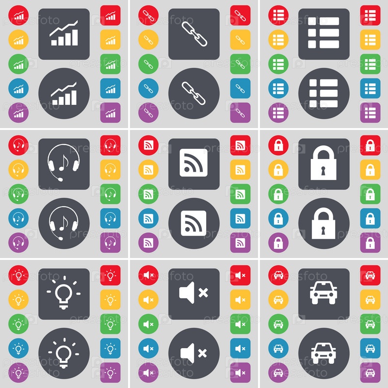 Граф, ссылки, список, наушники, RSS, замок, лампочки, немой, автомобильный значок символа.Большой набор плоских цветных кнопок для вашего дизайна.Вектор