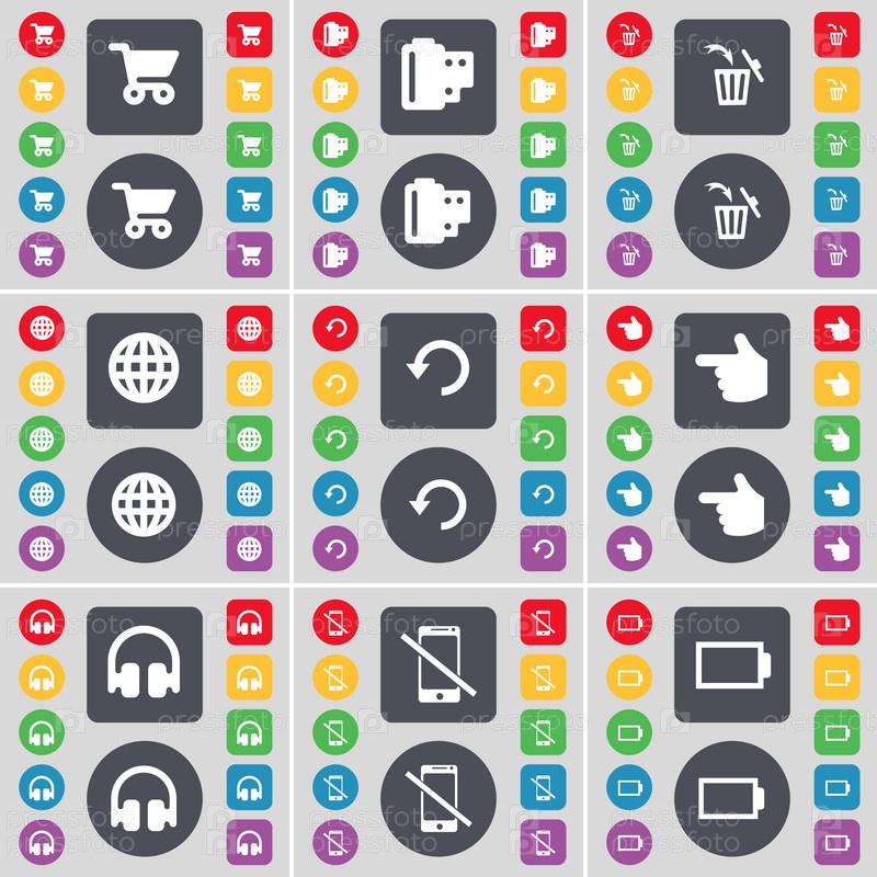 Корзина, негативных пленок, мусорный бак, глобус, перезагрузка, рука, наушники, смартфон, значок символ батареи. Большой набор плоских, цветные кнопки для вашего дизайна. Вектор