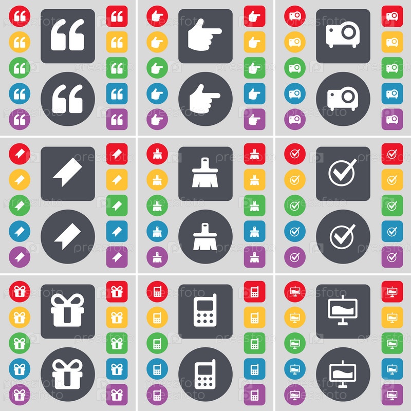 Кавычки, рука, проектор, маркер, кисть, тик, подарок, мобильный телефон, график значок символ. Большой набор плоских, цветные кнопки для вашего дизайна. Вектор