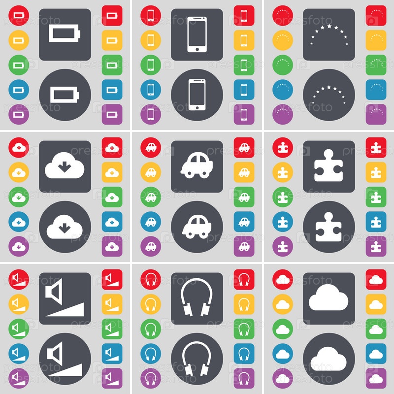 Аккумулятор, смартфон, звезды, облако, автомобиль, головоломки части, объем, наушники значок символа. Большой набор плоских, цветные кнопки для вашего дизайна. Вектор