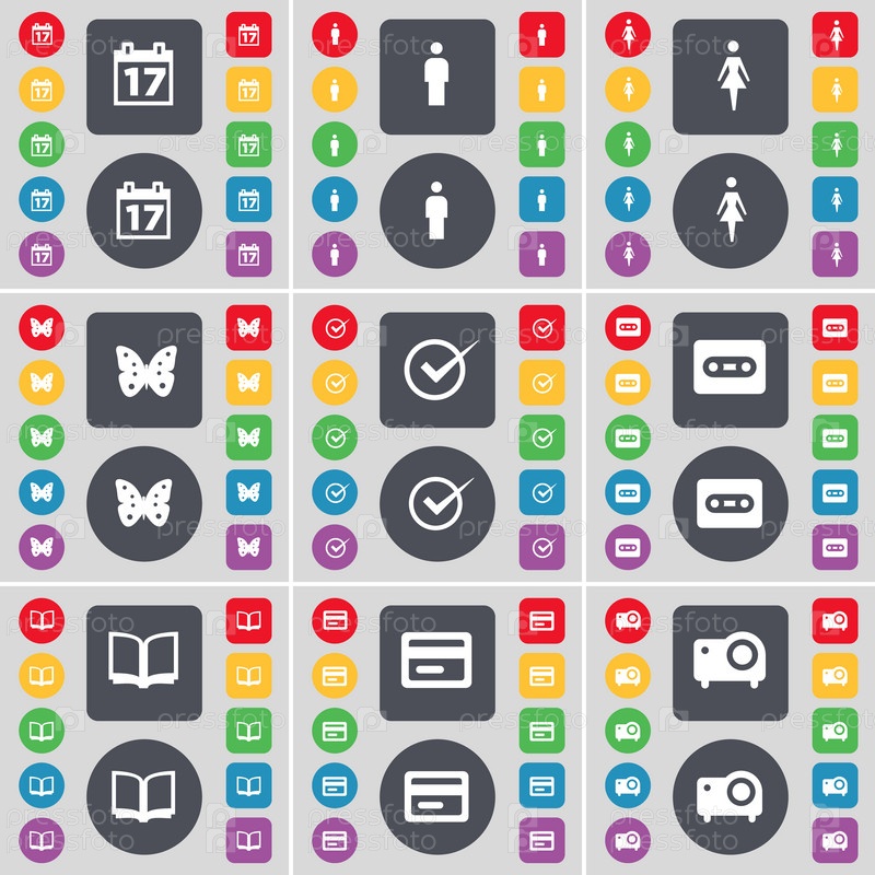 Календарь, силуэт, Бабочка, тик, кассеты, книги, кредитная карта, проектор значок символа. Большой набор плоских, цветные кнопки для вашего дизайна. Вектор