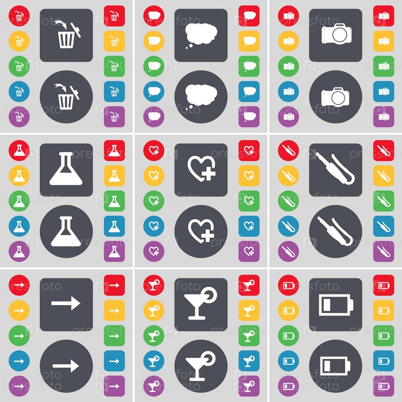 Мусор может чат облако, камеры, фляга, сердце, разъем для микрофона, стрелка вправо, коктейль, значок символ батареи. Большой набор плоских, цветные кнопки для вашего дизайна. Вектор