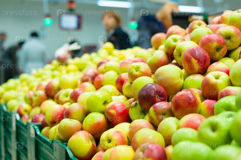 Яблоки в коробках в супермаркете