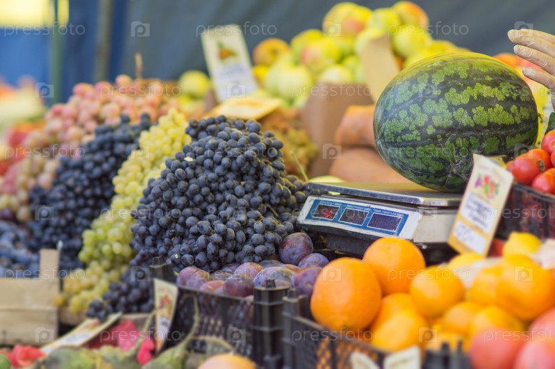 Арбуз на весах среди фруктов на городском рынке