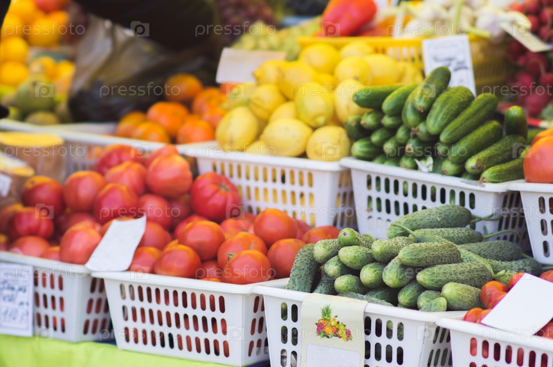 Помидоры, апельсины, лимоны, огурцы? виноград и тыквы в коробки на городской рынок