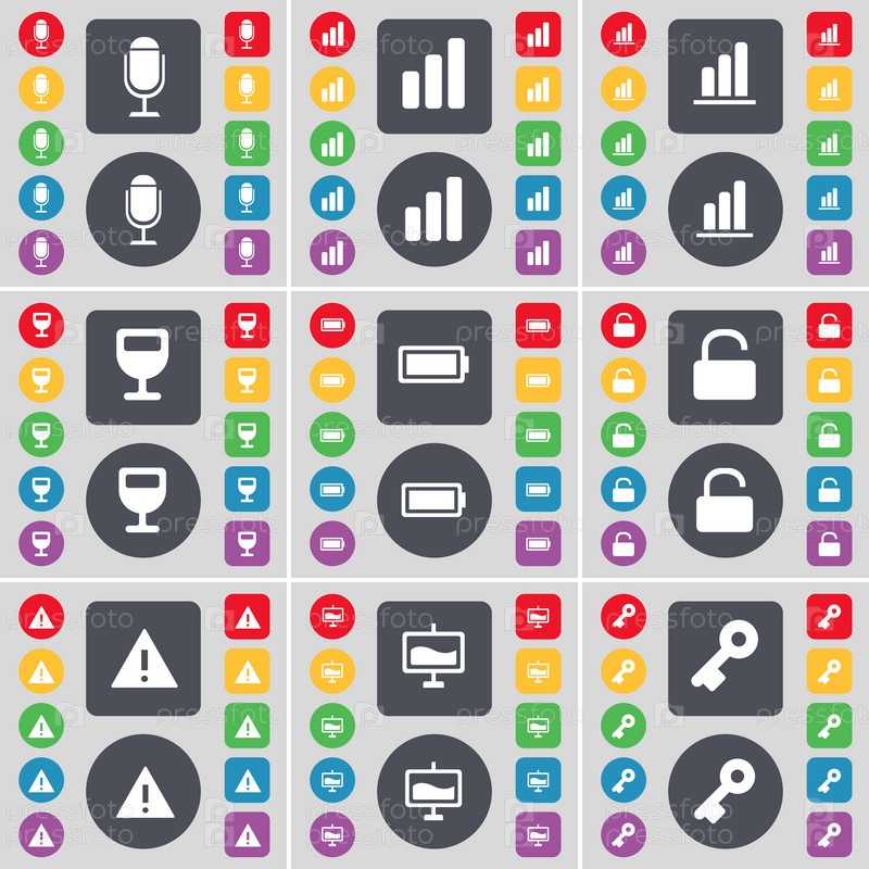 Микрофон, диаграмма, Wineglass, батареи, блокировка, предупреждение, граф, ключевые значки символа. большой набор плоских цветных кнопок для вашего дизайна. вектор