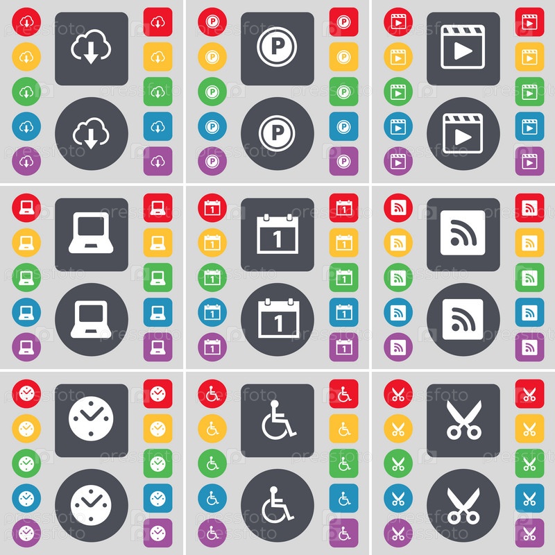 Облако, парковка, медиа-плеер, ноутбук, будильник, календарь, RSS, инвалиды, ножницы иконный символ. большой набор плоских цветных кнопок для вашего дизайна. вектор