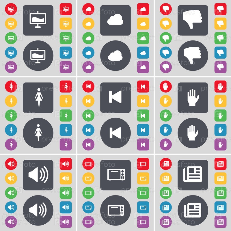 Граф, облако, неприязнь, силуэт, скип СМИ, стороны, звук, Микроволновая печь, газета значок символа. Большой набор плоских, цветные кнопки для вашего дизайна. Вектор
