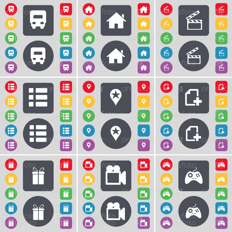Грузовик, дом, Клаппер, список, контрольно-пропускной пункт, файл, подарок, пленочной камеры, Геймпад значок символа. Большой набор плоских, цветные кнопки для вашего дизайна. Вектор