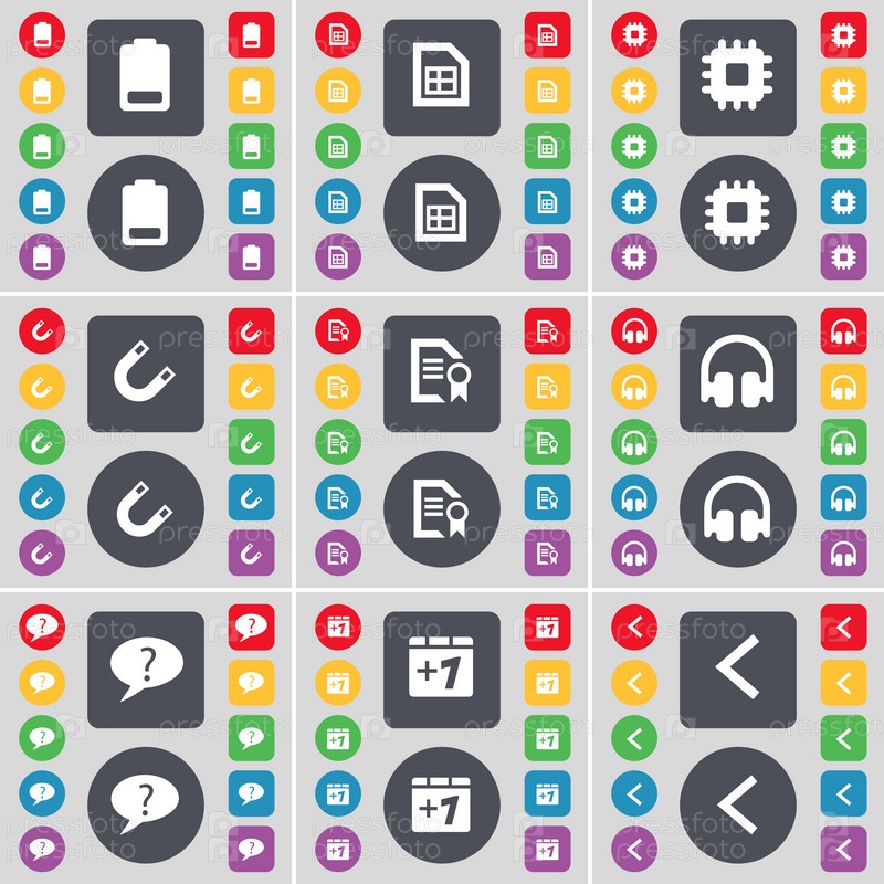 Аккумулятор, файл, процессор, магнит, текст файла, наушники, чат пузырь, плюс один, символ левый значок стрелки. Большой набор плоских, цветные кнопки для вашего дизайна. Вектор