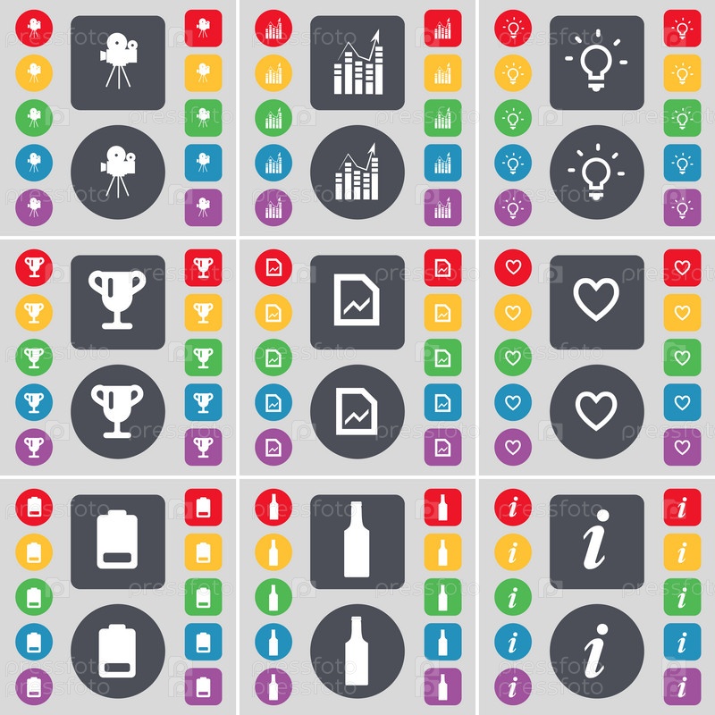 Фильм камеры, граф, лампочки, Кубок, граф, сердце, батарея, бутылка, информация значок символа. Большой набор плоских, цветные кнопки для вашего дизайна. Вектор
