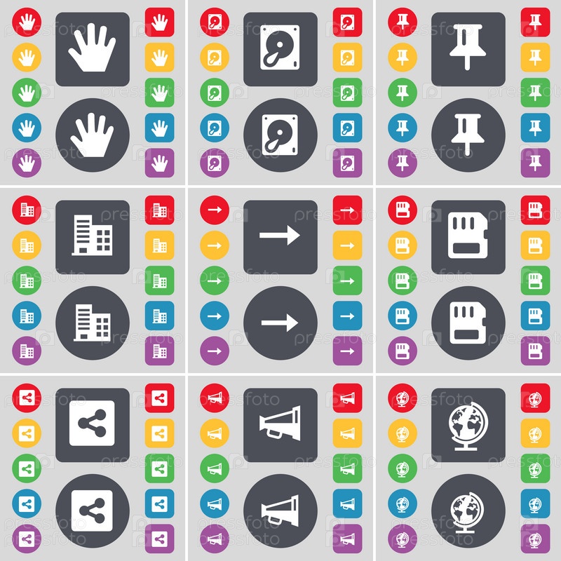 Рука, жёсткий диск, пин, строительство, стрелка направо, сим-карты, доля, Мегафон, иконка символа глобус. Большой набор плоских цветных кнопок для вашего дизайна. вектор