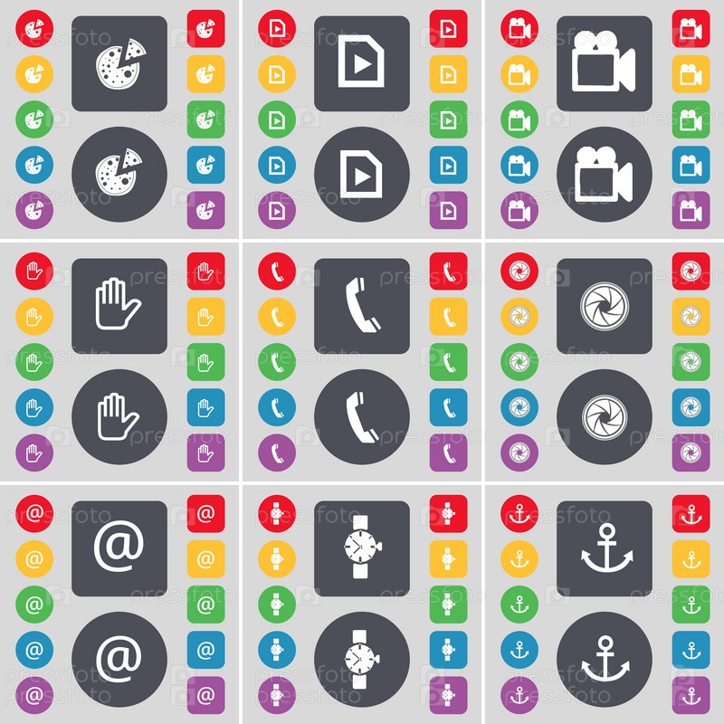 Пицца, средства массовой информации играют, пленочной камеры, рука, приемник, объектив, почта, наручные часы, якорь значок символа. Большой набор плоских, цветные кнопки для вашего дизайна. Вектор