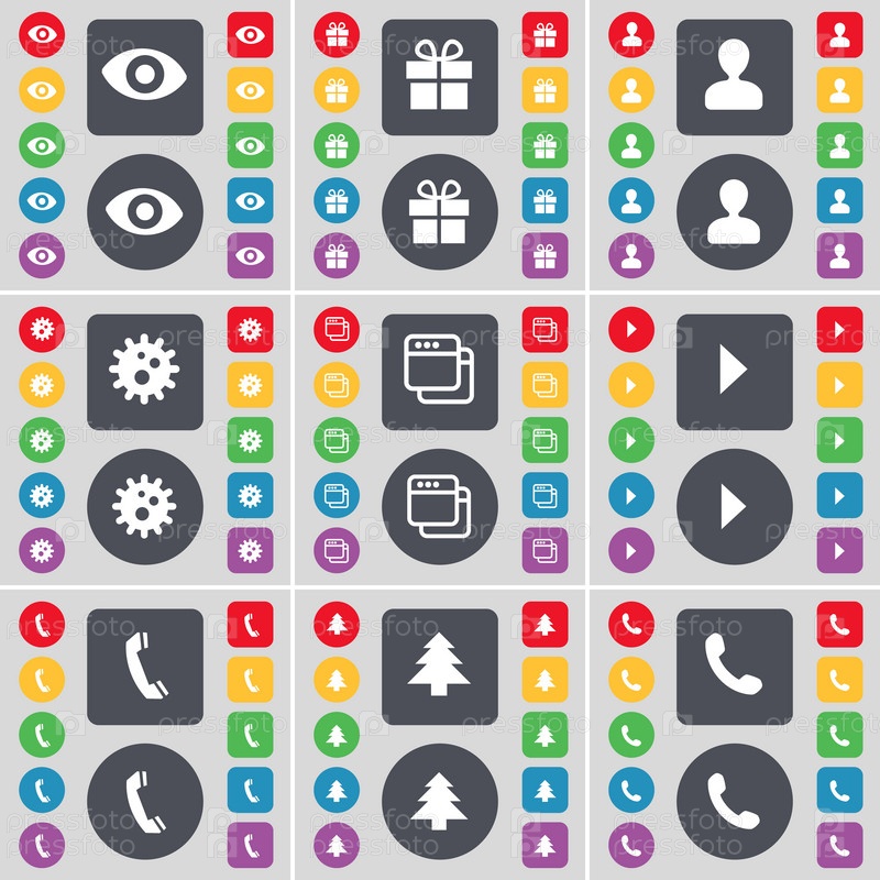 Видение, подарок, аватар, снаряжение, окна, средства массовой информации играть, приемник, елочка значок символа. Большой набор плоских, цветные кнопки для вашего дизайна. Вектор