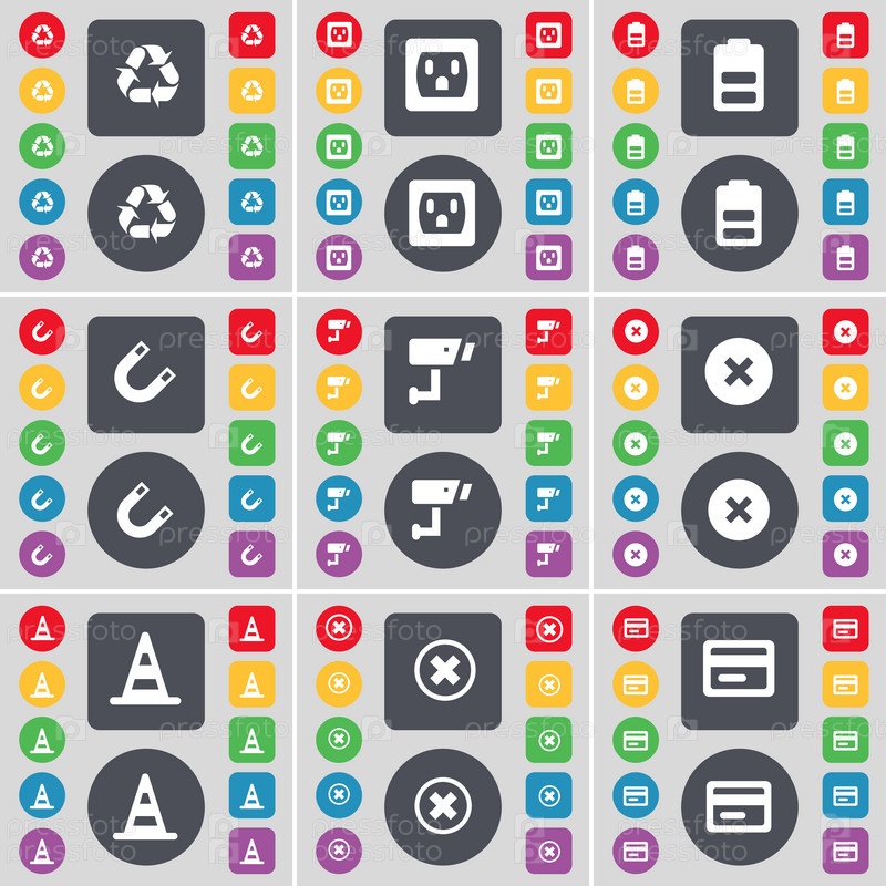 Переработка, разъем, батарея, магнит, CCTV, остановка, конус, стоп, кредитные карты значок символа. большой набор плоских цветных кнопок для вашего дизайна. вектор
