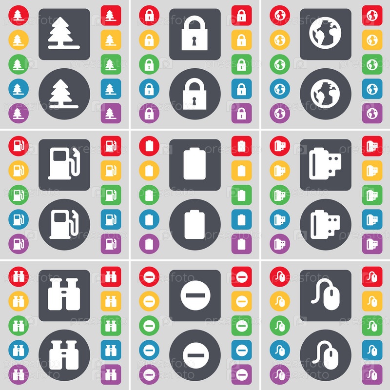 Елочка, замок, земля, автозаправочная станция, батарея, негативных пленок, бинокли, минус, мыши значок символа. Большой набор плоских, цветные кнопки для вашего дизайна. Вектор